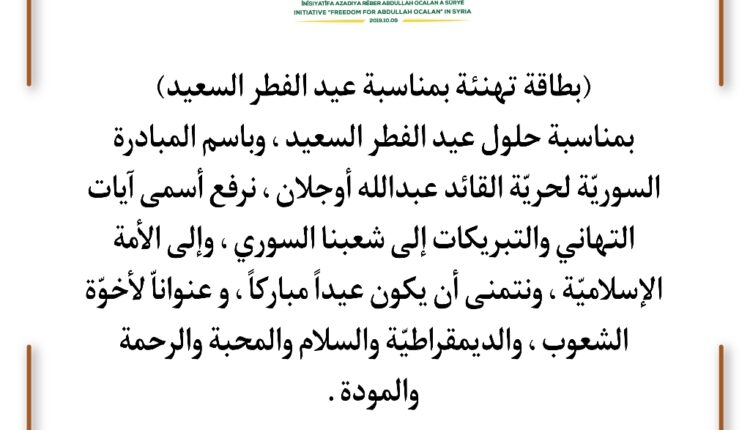 اخبار بطاقة تهنئة: بمناسبة حلول عيد الفطر سعيد By freedomocalansyria Last updated أبريل 9, 2024 817 Share 817 Share