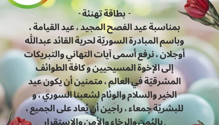 الصور بمناسبة عيد الفصح المجيد :بطاقة تهنئة By freedomocalansyria Last updated مايو 5, 2024 346 Share عيد فصيح مجيد: نبارك على الأخوة المسيحين 346 Share