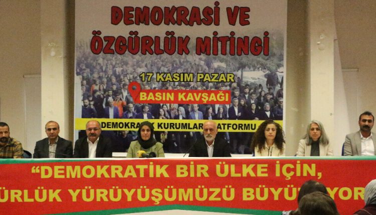 Li ser vê esasê, bi armanca pêşxistina rê û rêbazên çareseriya demokratîk em ê di 17’ê Mijdarê de li Êlihê mitîngekê lidar bixin. Li hemberî siyaseta qeyûman, li hemberî pergala ku aştî û demokrasiyê dîl digre, li hemberî polîtîkayên monîst roj roja mezinkirina têkoşîna azadiyê ye. Bi vê mebestê em tevî jin, ciwan, kedkar û gelên bindest vedixwînin Mitînga Demokrasî û Azadiyê. Werin em bi hev re li dijî vê zilmê dengê xwe bilind bikin û têkoşîna azadiyê geş bikin.”