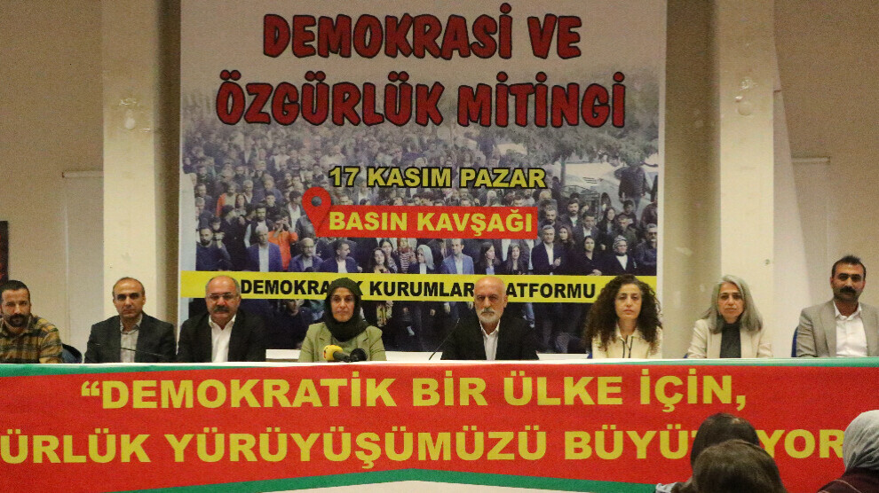 Platforma Saziyên Demokratîk ji bo mitînga 17’ê mijdarê ya li Êlihê, deklarasyona “Demokrasî û Azadiyê” ragihand. Daxuyanî, li eywana Sendîkaya Petrol Îşê hate xwendni. Hevserokên Giştî yên Partiya Herêman a Demokratîk (DBP) Çîgdem Kiliçgun Uçar û Keskîn Bayindir, parlamenterên Partiya Wekhevî û Demokrasiyê ya Gelan (DEM Partî), aktîvîstên Tevgera Jinên Azad (TJA) jî tev li bûn. Di daxuyaniyê de pankarta “Ji bo welatekî demokratîk em meşa xwe ya azadiyê mezin dikin” hate hilgirtin.