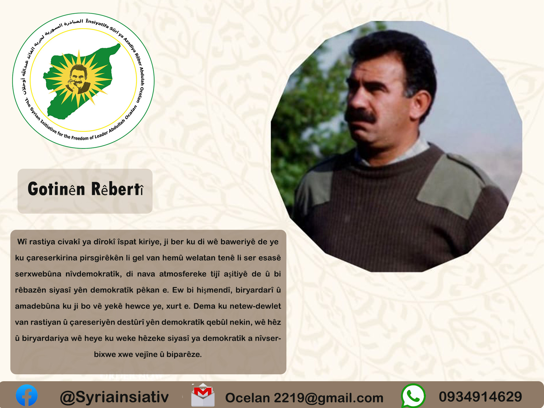GOTIN Gotinên Rêbertî Bi rêya freedomocalansyria Nûkirina dawî Mar 24, 2025 0 114 Bi par ve bike 0 114 Bi par ve bike