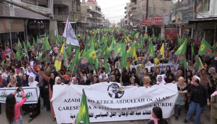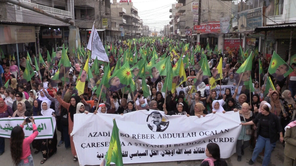 Kurd, Ereb, Suryan, Ermen û Êzidî, bi hezaran kes ji şêniyên Qamişloyê ji bo azadiya Rêber Apo meşiyan. Girseya gel destnîşan kir ku aştî bi azadiya fîzîkî ya Rêber Apo dibe.