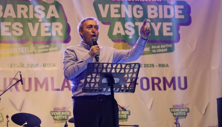 Hevserokê Giştî yê DEM Partiyê Tuncer Bakirhan di mîtînga 1’ê Îlonê Roja Aştiyê ya Cîhanê ya li Rihayê axivî û got: “Hûn nikarin Birêz Ocalan di hucreyeke 12 metreyî de asê bikin; pêwîst e ew bi gelê xwe re bicive.”