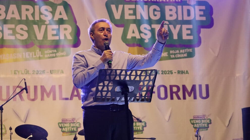 Platforma Saziyên Demokratîk ji bo 1’ê Îlonê Roja Aştiyê ya Cîhanê li Parka Riha Novada bi dirûşmeya “Ji bo Civaka Demokratîk Deng Bidin Aştiyê” mîtîngek li dar xist. Aktivîsta Tevgera Jinên Azad (TJA) Ayla Akat Ata, Hevseroka Konfederasyona Sendîkayên Karmendên Giştî (KESK) Ayfer Koçak, Hevserokê Giştî yê Partiya Wekhevî û Demokrasiyê ya Gelan (DEM) Tuncer Bakirhan, parlamenterên Rihayê yên DEM Partiyê Dîlan Kunt Ayan û Omer Ocalan, birayê Rêber Apo, Ocalan Mehmet Ocalan, Meclîsa Dayikên Aştiyê, endamên rêxistinên bajar û navçeyan ên Partiya Herêmên Demokratîk (DBP) û DEM Partî, rêxistinên civaka sivîl û bi deh hezaran kes beşdarî mîtîngê bûn. Bi hezaran kesan dirûşmeyên “Bijî Serok Apo”, “Bê Serok Jiyan nabe” û “Jin, Jiyan, Azadî” berz kirin.