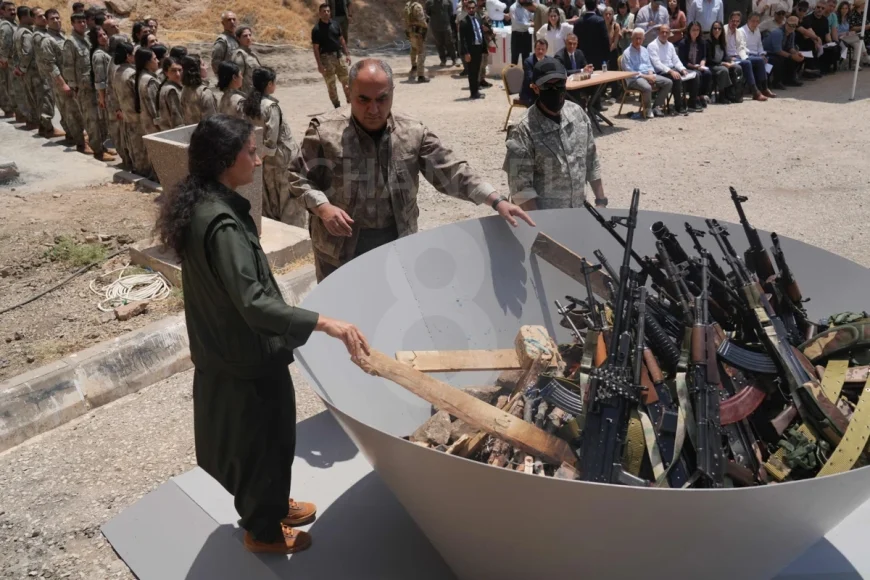 ŞEWITANDINA ÇEKAN Piştî vê bangê, 11’ê Tîrmehê 30 gerîlayên PKK’ê ku navê Koma Aştî û Civaka Demokratîk li xwe kir, bi merasimeke li Silêmaniyê çekên xwe şewitandin. Hevseroka KCK’ê Besê Hozat ku daxuyaniya li ser mijarê xwend, ev peyam da: “Çek êdî ne astengî ye. Êdî dora aliyê din e.” Merasîma şewitandina çekan ji aliyê sedan rojnamevanên ji Tirkiye, Kurdistan û cîhanê, dîsa gelek siyasetmedar, rewşenbîr û rêxistinan ve hat şopandin, li cîhanê deng veda.