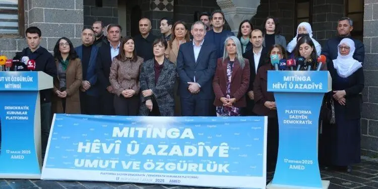 Platforma Saziyên Demokratîk, dê di 4’ê Çileyê de li Amedê “Mitînga Hêvî û Azadiyê” li dar bixe. Deklarasyona mitîngê, li Qonaxa Cemîl Paşayê bi daxuyaniyekê hat aşkerakirin. Hevserokên Giştî yên Partiya Herêmên Demokratîk (DBP) Çîgdem Kiliçgun Uçar û Keskîn Bayindir, Hevberdevkên Kongreya Demokratîk a Gelan (HDK) Meral Daniş Beştaş û Alî Kenanoglû, Hevserokê Giştî yê Partiya Wekhevî û Demokrasiyê ya Gelan (DEM Partî) Tuncer Bakirhan, nûnerên partiyên siyasî û rêxistinên civaka sivîl tev li daxuyaniyê bûn.