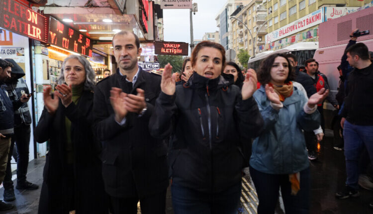 Gelê ku li Amedê ji bo Meşa Azadiyê hatin cem hev, li ber avahiya HEDEP’ê ya dorpêçkirî daxuyanî dan.